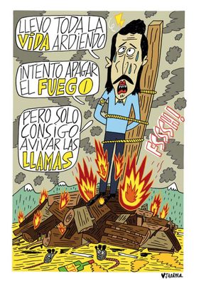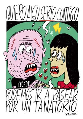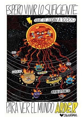 Odio desde el cariño. Dicho así puede parecer un concepto improbable, aunque algo parecido a eso es lo que exuda ABRÁZAME HASTA QUE ESTA VIDA DEJE DE DAR PUTO ASCO de Juarma. Se cisca en la idiocia generalizada, se mofa de la mentira sistémica y principalmente, de lo a gusto que la deglute el personal y de cómo ejercen de cómplices, chivatos y carceleros de esta patraña mal organizada. Hay cantidades escalables de mala hostia, de justificadísimo odio a la humanidad y deseos de exterminio, pero desde el cariño, a ver si me explico, medio apelando a un propósito de la enmienda en un tono de humor descacharrante con la suficiente ironía y acierto como para interpelar a cualquiera que medio le funcione la cabeza. Frases lapidarias en una sola viñeta que catalizan la realidad y la mala leche transformándola en deshueve y reflexión.