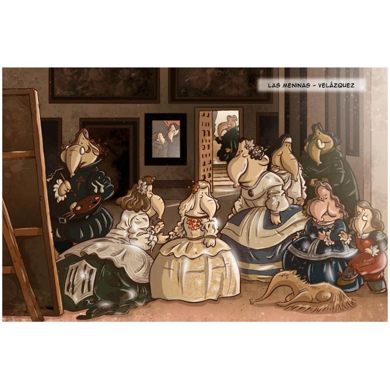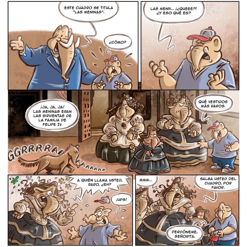 Lo que para Fer iba a ser una tarde con su padre en el museo, se convierte en una emocionante aventura llena de persecuciones y sorpresas dentro de los cuadros más famosos de la Historia del Arte. Eso hemos dicho, esta no es una típica visita al museo. Aquí viajaremos atravesando los cuadros de museos tan importantes como El Prado, el Louvre o el d ÆOrsay. Los lienzos cobran vida y los personajes de las obras de arte nos contarán los secretos detrás de sus pinturas. Hablaremos con artistas de la talla de Picasso, Sorolla, Velázquez, Leonardo da Vinci, Magritte, Rubens, Monet o Van Gogh quienes nos enseñarán a dibujar como si fuéramos auténticos maestros del pincel. Pero cuidado, no todos los protagonistas de los cuadros son amigables y quieren conocernos, en algunas obras encontraremos peligros a los que enfrentarnos y que nos obligarán a huir para no ser atrapados. El cómic esconde un secreto más, ¿quieres descubrir por qué Fer es un elefante? Para eso tendrás que leer AVENTURA EN EL MUSEO. Un cómic perfecto para pequeños elefantes (y humanos curiosos).