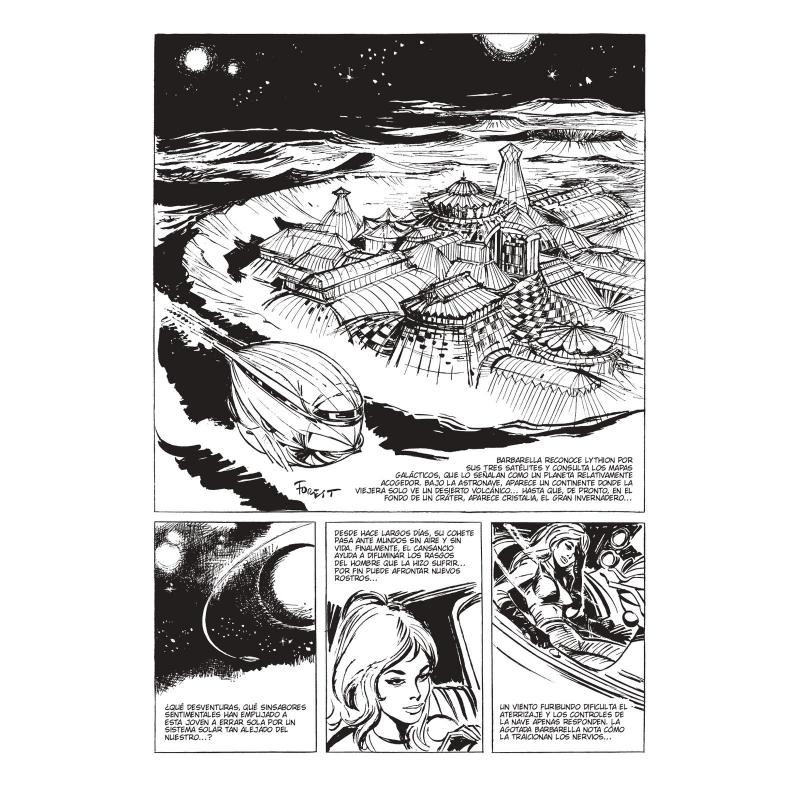 Viene de otro lugar, de otro tiempo, y salta de un planeta a otro, de unos brazos a otros, huyendo del pasado y entregándose al destino. Dueña de su desnudez y su deseo, desbordante, sin límites ni ataduras, y pacifista, Barbarella llevará al límite aquello de "haz el amor y no la guerra" explorando mundos fantásticos y absurdos donde el diálogo y la pasión se interpondrán a la guerra y al desastre. Inédita en España durante más de sesenta años desde su debut serializado en la revista V Magazine (1962) y convertida en icono de la cultura pop gracias a la película protagonizada por Jane Fonda (1968), este volumen incluye íntegramente este revolucionario clásico de la ciencia ficción impregnado de erotismo creado por Jean-Claude Forest, en una completa edición repleta de extras y una recopilación de todas las portadas internacionales de Barbarella. "Con aquella vaga idea de historias de ciencia ficción, una protagonista femenina y muchos toques de erotismo, creó a Barbarella, un icono de los años sesenta, una referencia mundial del cómic, que cambiaría el rumbo de la opinión sobre el lenguaje de las viñetas en Europa, y que sesenta años después es un clásico, una obra maestra". Ángel de la Calle (Pinturas de guerra) "Con Barbarella, Forest revolucionó el panorama del cómic europeo atrayendo la atención del público adulto y sentando las bases del cómic de autor que marcaría la historieta de finales de los sesenta y setenta. Una obra fundamental en la historia del noveno arte de la segunda mitad del siglo XX ". Carlos Portela (Las nuevas aventuras de Esther. La Boda)