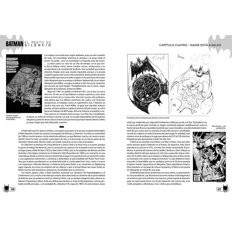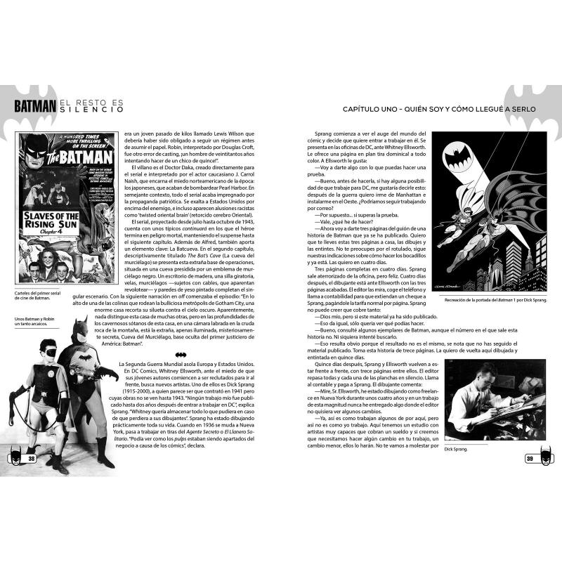 Batman debutó en las páginas de Detective Comics en 1939, cuando el joven Bruce Wayne juró vengar la muerte de sus padres y luchar por la justicia en su Gotham City natal. Hoy en día, el héroe es uno de los iconos más poderosos de la cultura pop en todo el mundo y a su espalda se encuentran algunos de los cómics más importantes del medio, por autores como Frank Miller, Neal Adams, Alan Moore, David Mazzucchelli, Brian Bolland, Steve Englehart, Jeph Loeb, Tim Sale o Jim Lee. En Batman: El resto es silencio, David Hernando realiza un extenso repaso a los más de 85 años de trayectoria del Caballero Oscuro en el cómic, el cine, la televisión y más allá, diseccionando la esencia del héroe de DC Comics y profundizando en detalle en sus orígenes, su evolución y los momentos más importantes de su historia. Este libro recoge y amplía la edición original de 2004, extendiendo el análisis a las etapas modernas del personaje firmadas por estrellas como Grant Morrison, Frank Quitely, Scott Snyder, Greg Capullo, Geoff Johns o Tom King, así como sus distintos regresos triunfales a la gran pantalla en la piel de Christian Bale, Ben Affleck o Robert Pattinson. Con esta ampliación, Batman: El resto es silencio se convierte en el libro definitivo sobre el Hombre Murciélago.
