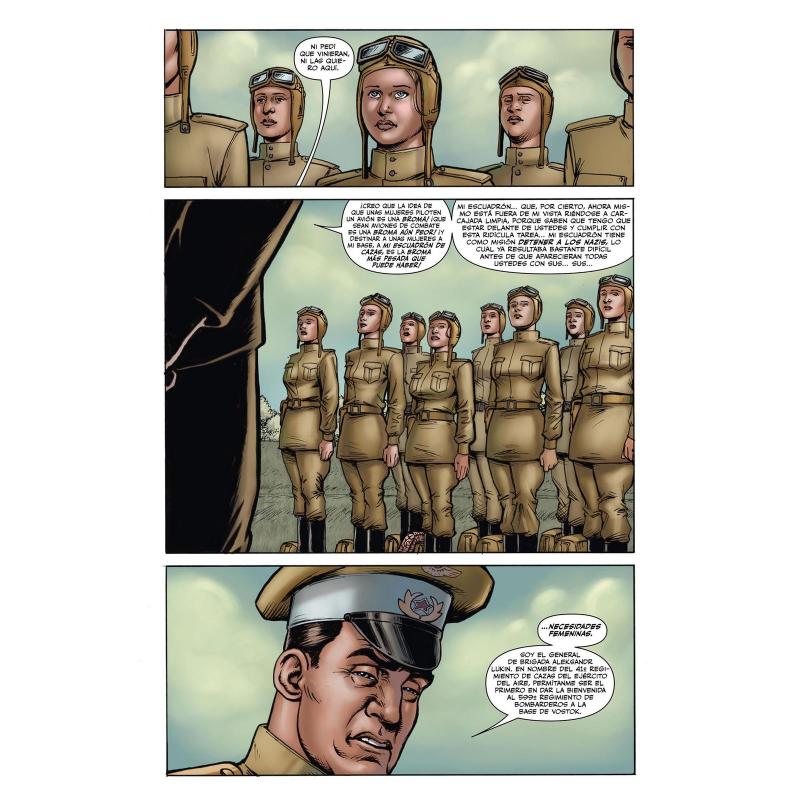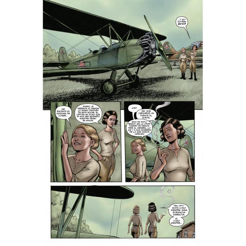 ¿Alguna vez piensas en qué nos pasaría si los nazis nos capturaran? Tres impactantes relatos basados en la historia real de combatientes rusas, sin miramientos a la hora de describir cómo se combatía en el violento frente oriental, realizados por de Garth Ennis (The Boys, Red Team) y Russ Braun (The Boys, Jack of Fables). BATTLEFIELDS: LA BRUJA DE LA NOCHE incluye por primera vez los volúmenes anteriormente publicados: Battlefields vol. 1: Las brujas de la noche Battlefields vol. 6: Madre patria Battlefields vol. 8: La caída y ascenso de Anna Kharkova A finales del verano de 1942, mientras el ejército alemán se adentra violentamente en la Rusia soviética y los defensores de la Madre Patria se retiran en desbandada, un nuevo escuadrón de bombarderos llega a un puesto avanzado aéreo situado en Rusia. Los pilotos volarán en biplanos endebles de madera para llevar a cabo letales misiones nocturnas al sobrevolar las líneas alemanas y arriesgarse a una muerte envueltos en llamas mientras arremeten contra el invasor; no obstante, para estos pilotos, ser capturados sería aún peor, puesto que los pilotos del 599º Regimiento de Bombarderos Nocturnos son mujeres. En el mortífero cielo del frente oriental, se convertirán en una leyenda entre aliados y enemigos por igual conocidas como las Brujas de la Noche. Una de ellas, la teniente Anna Kharkova, es asignada a un caza de un solo pasajero y enviada a la acción. Endurecida y amargada por la pérdida de sus camaradas, Anna solo quiere hincarle el diente al enemigo, pero, con Rusia y Alemania a punto de enfrentarse en la titánica batalla de Kursk, su primer vuelo con su nuevo escuadrón bien podría ser el último. Y con la policía secreta soviética husmeando, la muerte en el campo de batalla es casi preferible... En los últimos días de la Segunda Guerra Mundial, un terrible accidente deja a la ahora piloto de cazas rusa Anna Kharkova herida de gravedad y exiliada involuntariamente de su país. Anna comienza una odisea que la llevará de la batalla aérea sobre Corea a los horrores de los campos de castigo soviéticos, mientras crecen sus dudas sobre la causa por la que está luchando. Pero, en la cima del mundo, sobre el océano Ártico, la antigua Bruja de la Noche descubre que aún le queda un as bajo la manga.