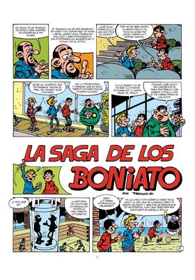 Las historietas de Benito Boniato retratan en clave de humor la vida cotidiana de un adolescente que vive con sus padres y su hermano pequeño, Julito, y que comparte con sus amigos Luis y Quintalón las alegrías y las penas de su vida de estudiante, tanto en el instituto como en el tiempo de ocio. Con su dibujo detallado, heredero de la escuela franco-belga, los hermanos Fresno aportaron un soplo de aire fresco en las publicaciones de humor de su época. Esta edición reúne por primera vez la serie completa y ordenada cronológicamente, partiendo de una cuidada restauración y un nuevo color. El presente volumen contiene dos historias largas (La saga de los Boniato y Los juegos deportivos), además de numerosas historias cortas publicadas originalmente en los años 1981 y 1982, acompañadas de unos extras que incluyen portadas, pósters y material inédito aportado por los propios autores.