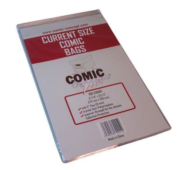Pack de 100 bolsas para comics de tamaño Current. Vienen presentadas en paquetes de 100 unidades. Tamaño: 17,5 x 26,9 cm.