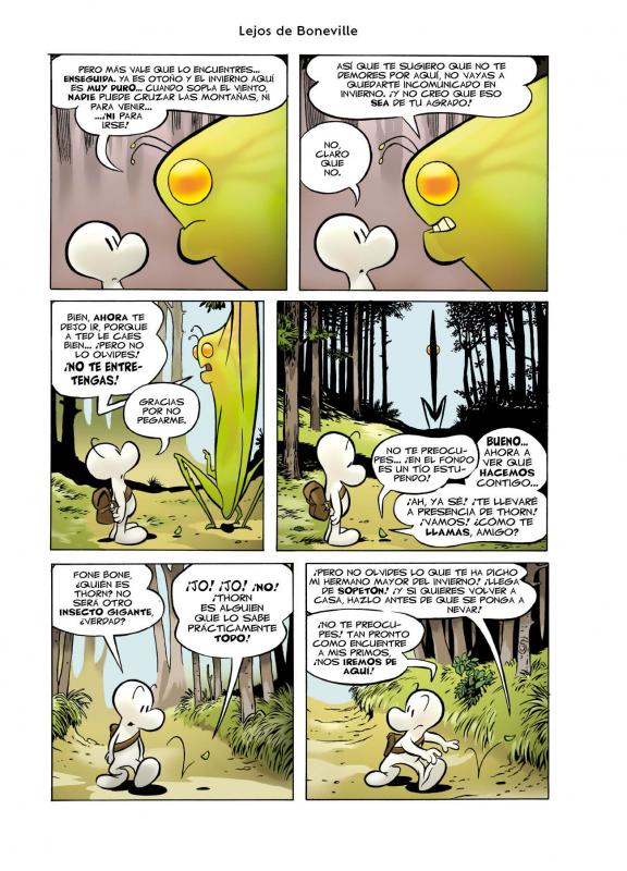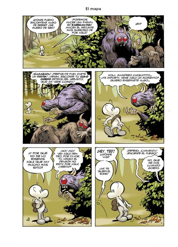 Mientras trata de encontrar a sus primos, Fone Bone se tropezará con una chica hermosa y valiente llamada Thorn, la abuela Ben, un misterioso dragón rojo y las amenazadoras mostrorratas, a las que suele perder su gula por las tartas. Tras diversos incidentes, los tres primos se reunirán en la ciudad de Barrelhaven, ajenos a la conspiración que se teje en torno a ellos y sin percatarse de que sus aventuras no han hecho más que empezar...