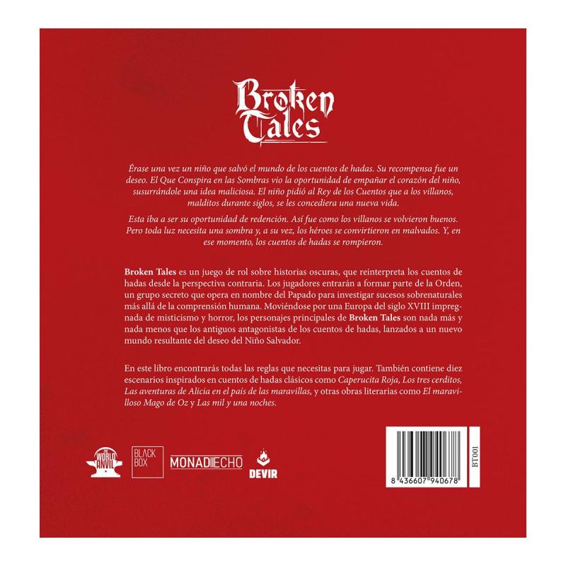 Broken Tales es un juego de rol sobre historias oscuras, que reinterpreta los cuentos de hadas desde la perspectiva contraria. Los jugadores entrarán a formar parte de la Orden, un grupo secreto que opera en nombre del Papado para investigar sucesos sobrenaturales más allá de la comprensión humana. Moviéndose por una Europa del siglo XVIII impregnada de misticismo y horror, los personajes principales de Broken Tales son nada más y nada menos que los antiguos antagonistas de los cuentos de hadas, lanzados a un nuevo mundo resultante del deseo del Niño Salvador.