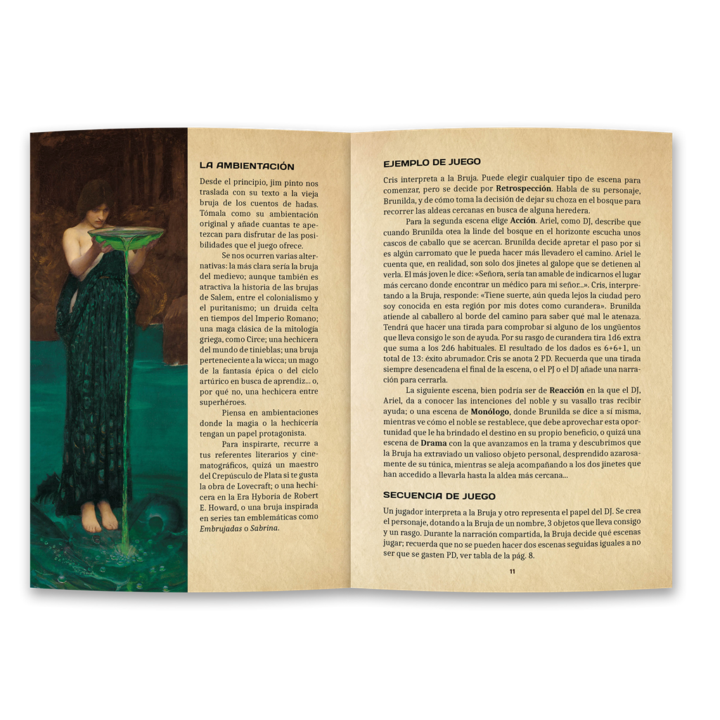 El motor del juego son las escenas, hay 5 tipos: Acción, Reacción, Drama, Monólogo y Retrospección. La Bruja elige un tipo de escena, hacéis el planteamiento de la misma y la jugáis hasta que aparezca un con? icto, entonces hacéis una tirada y pasáis a la siguiente escena; la única regla es que cada escena no puede ser del mismo tipo que la anterior.