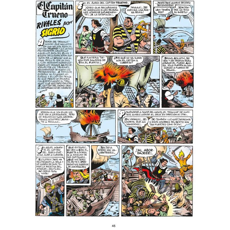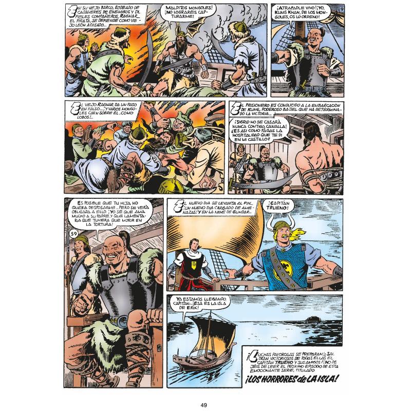 EDICIÓN LIMITADA Y NUMERADA. Este volumen de El Capitán Trueno incluye todas las aventuras publicadas entre octubre de 1957 y septiembre de 1958. Edición restaurada con nueva rotulación y mejoras en el color de las viñetas. El contenido principal proviene de los cuadernillos apaisados del 53 al 103. Adicionalmente lleva todas las historias que coexistieron en estos años. Del número 1387 hasta 1406 de la revista «Pulgarcito. Son dos historias de 9 capítulos cada una publicados en la página central del semanario. Por último se incluyen las aventuras publicadas en los primeros almanaques: «Aventura en Groenlandia» y«El fin de una discordia». Así mismo, este volumen contiene las magníficas portadas originales de Antonio Bernal y un material adicional único. Esta colección está publicando por primera vez de forma cronológica todo el contenido de este mítico personaje.