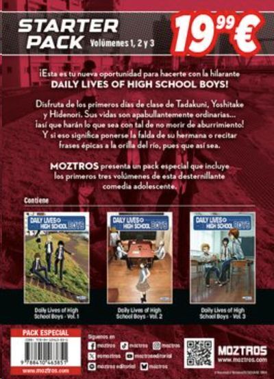 Esta es tu nueva oportunidad para hacerte con la hilarante Daily Lives of High School Boys! Disfruta de los primeros días de clase de Tadakuni, Yoshitake y Hidenori. Sus vidas son apabullantemente ordinarias... así que harán lo que sea con tal de no morir de aburrimiento! Y si eso significa ponerse la falda de su hermana o recitar frases épicas a la orilla del río, pues que así sea.