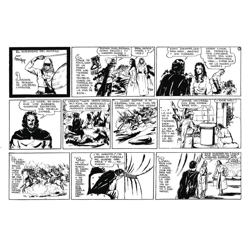Durante el reinado de los Reyes Católicos El conde de Roca, dando un paseo por las tierras de su vecino el conde de Torres, encuentra a su paso a la hija de este. Hace ochenta años, en 1944, Manuel Gago García, con tan solo diecinueve años, comenzó a narrar las aventuras de un héroe con antifaz cuya singladura se prolongaría ininterrumpidamente durante los 22 años siguientes, e incluso tras su reedición (1971-1978), todavía se extendería con Nuevas Aventuras durante dos años más (1979-1980). Solo el prematuro y triste fallecimiento del autor finalizó la aventura. Aquellas historias, ya leyenda del cómic español, supieron entretener y distraer al público de todas las edades durante al menos tres generaciones, algo que nunca debe quedar en el olvido. Este volumen contiene las primeras aventuras del Guerrero del Antifaz, en una edición restaurada con motivo de este 80º aniversario y complementada con varios textos que homenajean a uno de nuestros más prolíficos autores y a su personaje más característico.