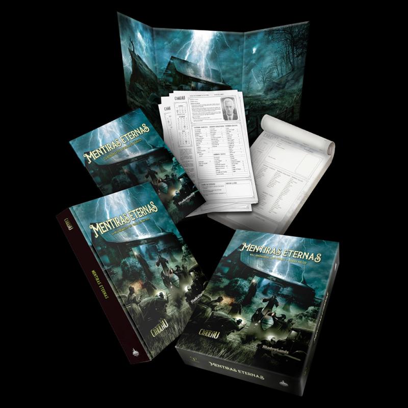 Libro de campaña de Mentiras eternas, 1 cuaderno de ayudas de juego, 1 Pantalla del Guardián con una ilustración exclusiva, 10 fichas con personajes pregenerados, 1 bloc de30 fichas