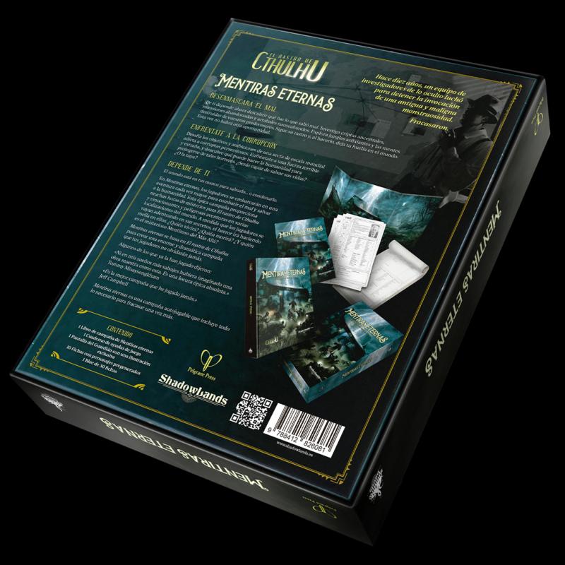 En Mentiras eternas, los jugadores se embarcarán en una aventura por todo el planeta para combatir el mal y salvar a la humanidad. Esta épica campaña proporciona muchas horas de misterios para El Rastro de Cthulhu, y emocionantes y peligrosas aventuras en varias localizaciones del mundo.