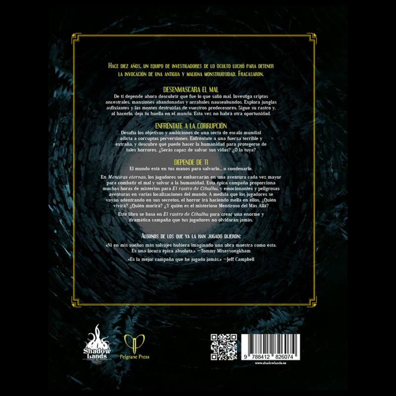 En Mentiras eternas, los jugadores se embarcarán en una aventura por todo el planeta para combatir el mal y salvar a la humanidad. Esta épica campaña proporciona muchas horas de misterios para El Rastro de Cthulhu, y emocionantes y peligrosas aventuras en varias localizaciones del mundo.