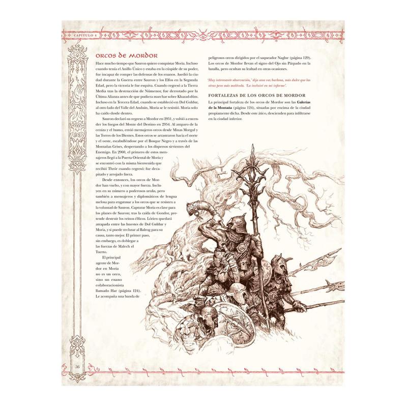 Durante largas edades, la gran ciudad de la Mina del Enano fue la sede de los reyes de los enanos. Cavaron demasiado hondo bajo las raíces de las montañas en busca de mithril, la legendaria plata de Moria. Allí forjaron maravillas, a la luz de lámparas de vidrio. Pero hace mil años, el Daño de Durin se alzó y expulsó a los enanos de sus salones. La ciudad cayó en la oscuridad, convirtiéndose en morada de orcos, trasgos y cosas peores. El arpa ya no suena, el martillo no cae; la sombr...