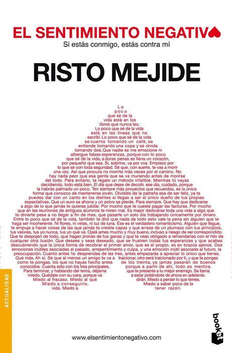 Un año y algunos meses después de irrumpir en el mercado editorial con El pensamiento negativo, Risto Mejide, el controvertido publicista, columnista, jurado de Operación Triunfo y productor discográfico publica una nueva entrega de sus reflexiones sobre el mundo que le rodea. Armado de la honestidad y la contundencia ve rbal que lo han hecho célebre, y con el mundo de las emociones y lo negativo como hilos conductores, en El sentimiento negativo Mejide nos provoca desde su portada/contraportada hasta la última/primera de sus páginas para defender la idea de que lo negativo no es más que la otra cara de la moneda de lo positivo, de la felicidad. Porque la felicidad no deja de ser un sentimiento que el mundo de la publicidad, la televisión o la Iglesia se empeñan en imponernos como meta vital desde el mismo instante en que nacemos, pero puede que para ser feliz no haya que hacer caso de lo que nos diga ningún publicista, el mejor de los telepredicadores o el mismísimo Ratzinger.