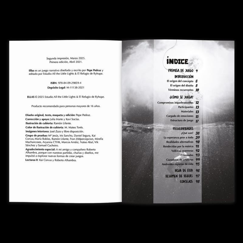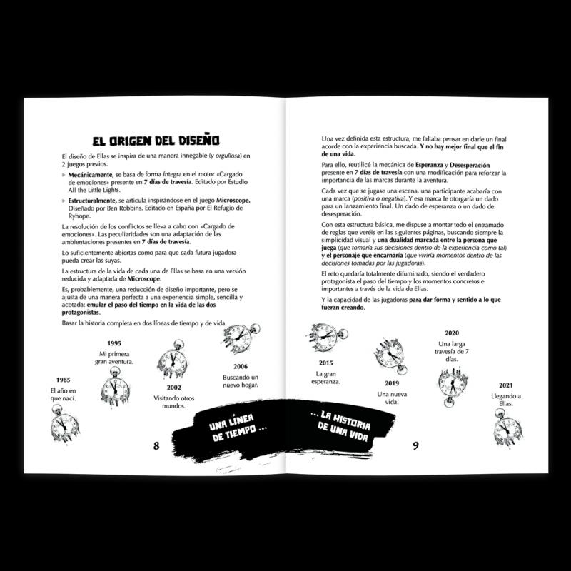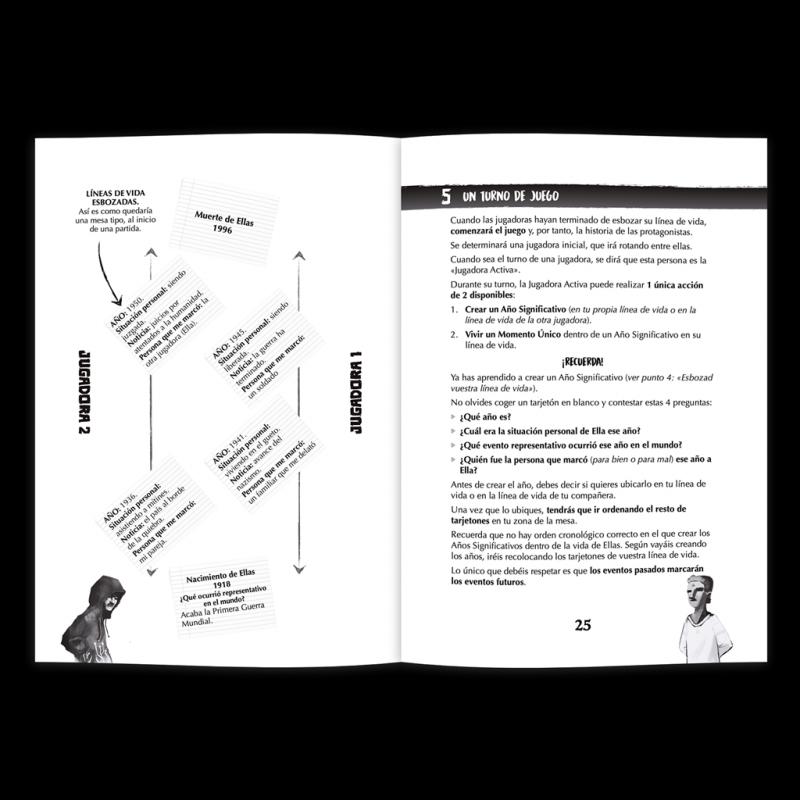 Un juego narrativo diseñado para 2 personas, con la posibilidad de incorporar una tercera a modo de guía para facilitar la experiencia de juego, sin necesidad de preparación. En Ellas, se recrea la vida de dos personas, desde su nacimiento (el mismo día, del mismo mes, de idéntico año) hasta su muerte.