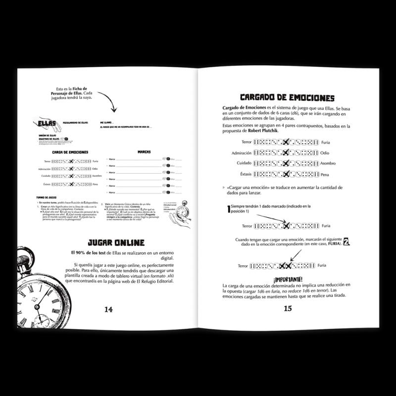 Si os gusta 7 días de travesía, os gustará (probablemente) Ellas (y viceversa, claro). Es menos duro con las tiradas y los resultados, pero el motor es «Cargado de emociones». En Ellas las «peculiaridades» son, incluso, más cortas de diseñar por parte de las participantes (ocupan un A5), y están acompañadas de recomendaciones musicales.