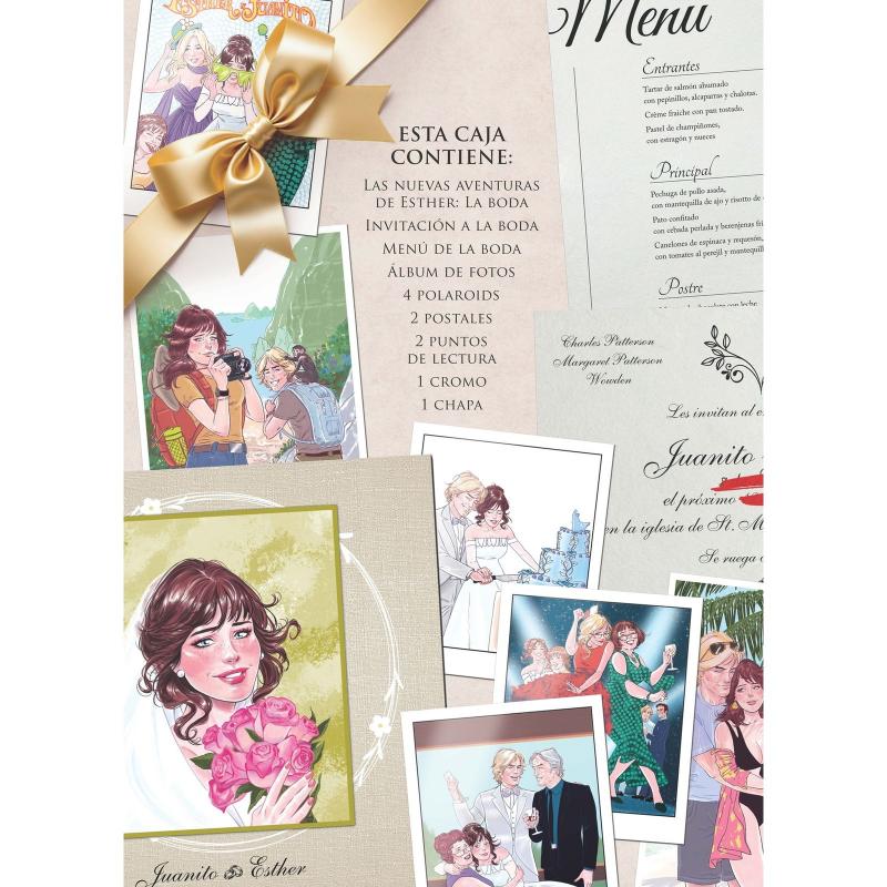 Con el estuche de Esther. La Boda, podrás revivir ese día tan especial como si hubieses asistido. Este estuche incluye los detalles más exclusivos de una boda única: la invitación, el menú, álbum de fotos, polaroids, postales, cromos, chapa y 2 puntos de libro a juego. Y, obviamente, el libro de Las nuevas aventuras de Esther. La boda.