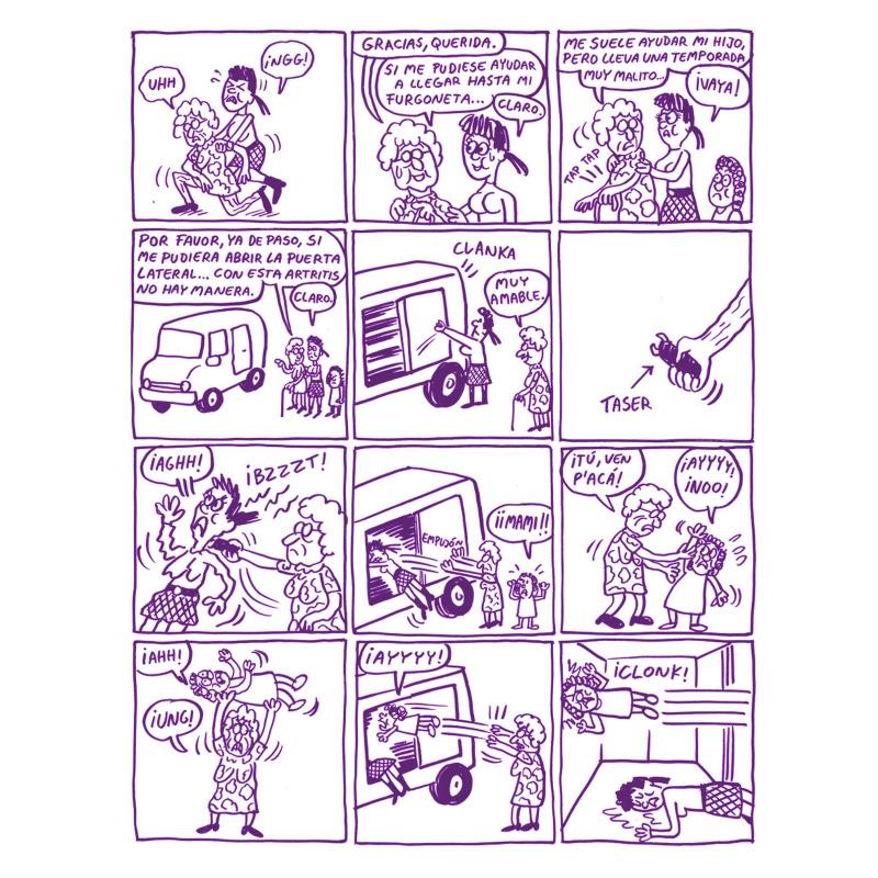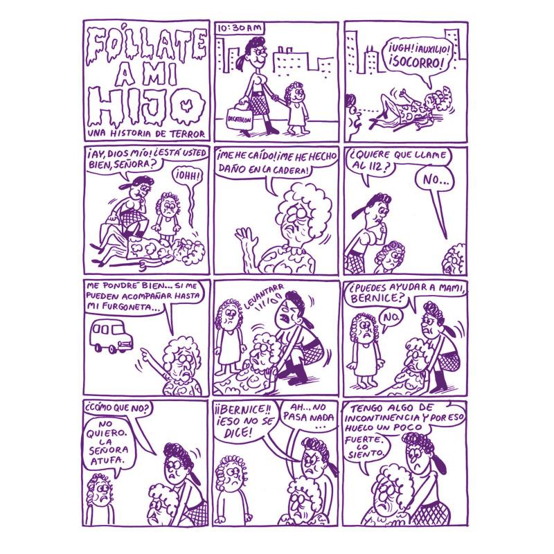 ¿Ha oído usted hablar de la autocensura? Pues Johnny Ryan no. A él todo eso de los tebeos que ya no se pueden hacer, la falta de libertad y los límites del humor le suenan a milonga rioplatense. «Fóllate a mi hijo» es un libro de amor maternal, ¿hasta dónde está dispuesta a llegar una madre para favorecer el ayuntamiento carnal de su hijo? ¿a la coacción? ¿amenazas? ¿secuestro? Va bien, va bien... siga, siga. «Fóllate a mi hijo» tiene aire de esas novelas negras pasadísimas de rosca en las que la Carmen Mola de turno va estresando la situación a todo lo que da, en un tour de force por lograr que el lector aparte la mirada, sienta pánico y repulsión. En ese tremendo esfuerzo por generar terror es frecuente que estas novelas rocen la comicidad, una comicidad extrema y rara, pero que da risa a fin de cuentas. En este caso Johnny Ryan es cómplice del lector y lleva la crueldad y el mal rollo al extremo, provocando una extraña mueca que es mezcla de sonrisa y repelús, y generando en su glotis sonidos guturales a medio camino entre la carcajada y la arcada.
