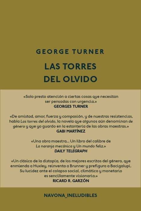 Solo presto atención a las cosas que necesitan ser pensadas con urgencia, George Turner De amistad, amor, fuera y compasión, y de nuestras resistencias, habla Las torres del olvido, la novela que algunos todavía denominan de género y que yo guardo en la estantería de las obras maestras, Gabi Martínez Una obra maestra Un libro del calibre de La naranja mecánica y de Un mundo feliz, Daily Telegraph Un clásico de la distopía, de los mejores escritos del género, que enmienda a Huxley, reinventa a Brunner y prefigura a Bacigalupi. Su lucidez ante el colapso social, climático y monetario es sencillamente visionaria, Ricard R. Garzón.