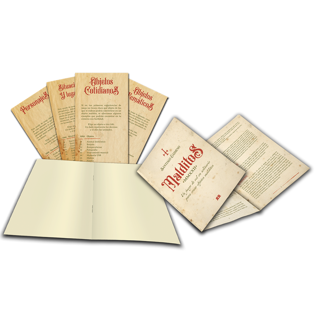 La edición consta de un cuaderno, a modo de grimorio, y un tríptico con las reglas del juego. Además, incluye 4 tablas d66 con nuevos puntos de vista que dan una vuelta de tuerca a las reglas originales: una de objetos cotidianos, para ayudarte en tus primeras partidas (brújula, canción, juego de mesa...); una de objetos temáticos, que te harán crear objetos malditos en torno al terror, la fantasía o la ciencia ?cción (un puzle incompleto, una bolsa de monedas, un holagrama defectuoso...); otra de situaciones y lugares, que te sitúa en espacios o vivencias donde, siento tú o un personaje de tu invención, tendrás que crear el objeto maldito (una trinchera de la I Guerra Mundial, un circo ambulante, un monumento megalítico...); y, por último, una de personajes, donde las propuestas te llevan a ponerte en la piel de un personaje concreto y crear el objeto a partir de ahí (una guerrera vikinga, un escritor de novelas de aventuras, un ser feérico en un plano que no le pertenece...)