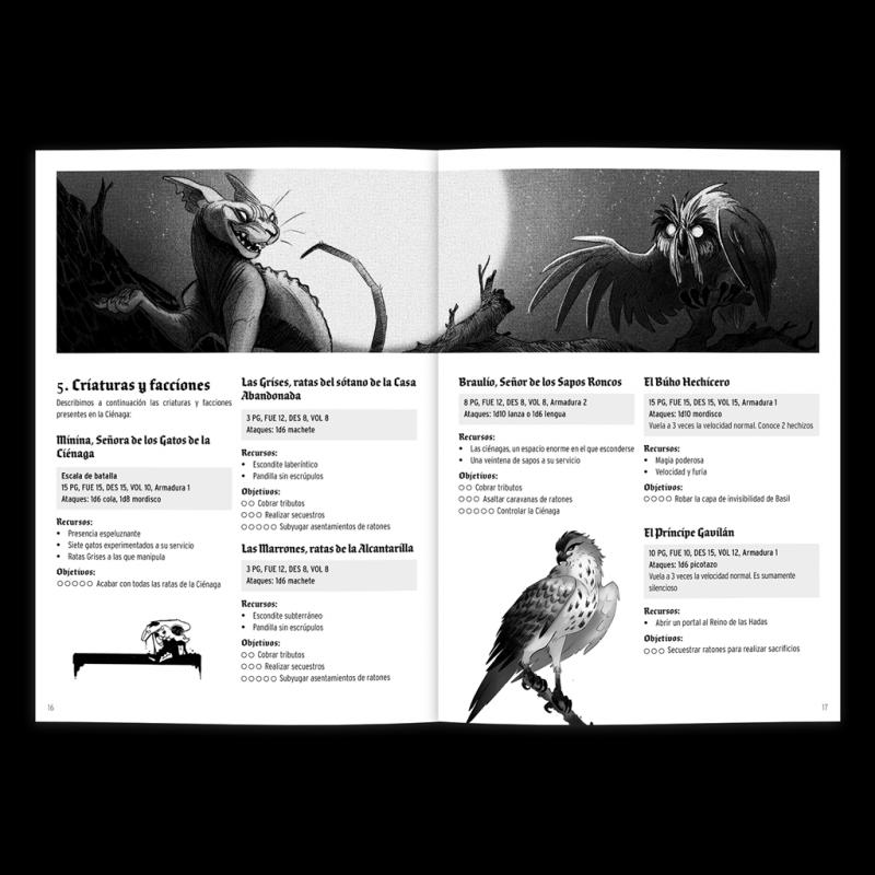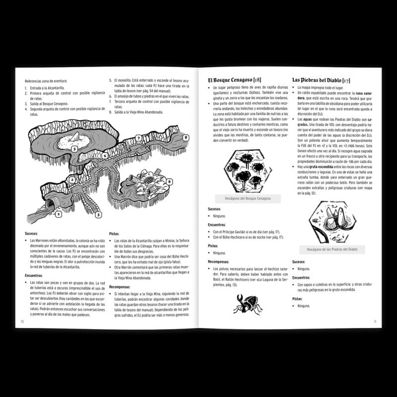 Además, hay un capítulo dedicado a las criaturas y facciones que habitan la Ciénaga (tanto aliadas como crueles enemigas), y tablas útiles (al estilo de las del manual básico) que servirán de ayuda al DJ: encuentros con ratas, gatos, sapos y otras criaturas, lugares y encuentros singulares; así como sugerencias para completar los hexágonos vacíos.