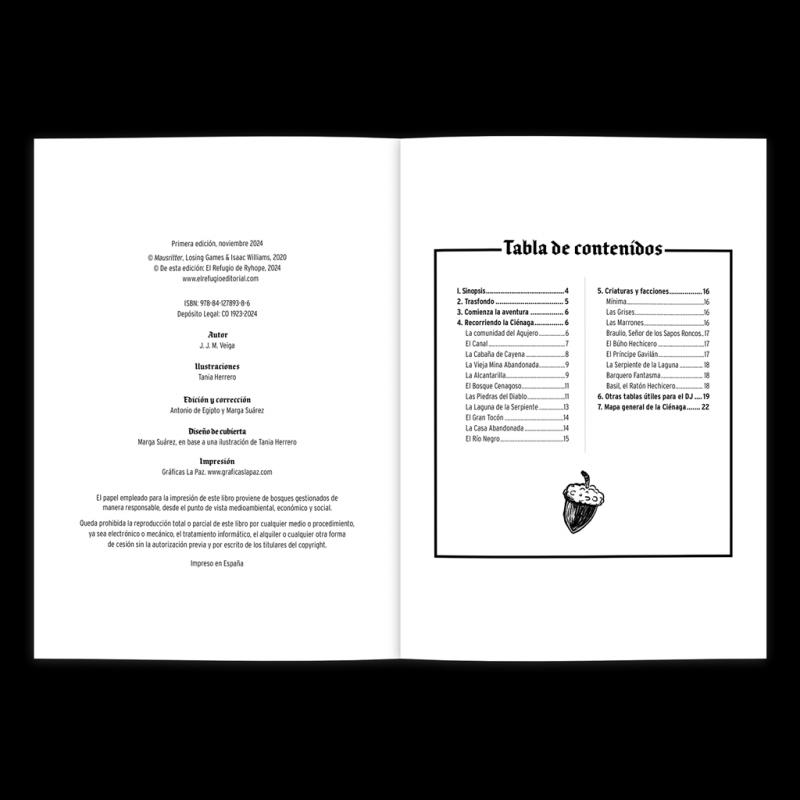 Manual de 24 páginas + 3 pliegos en A5 (mapa de la Ciénaga y miniaturas con los protagonistas)