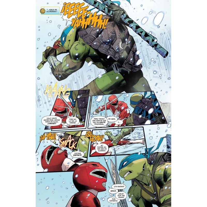 Las aventuras entre los Héroes con caparazón y los adolescentes más poderosos, continúan! Seis meses después de que los Power Rangers y las Tortugas Ninja unieran fuerzas para derrotar a la maligna alianza de Rita Repulsa y Shredder, una nueva amenaza los obliga a reunirse de nuevo! Las alianzas prohibidas terminan por colisionar en impactantes sucesos inesperados mientras que las alucinantes de Zord se vuelven cada vez más aterradoas. Unidos nuevamente, ambos grupos de héroes se enfrentarán a Krang, pero... ¿bastarán sus esfuerzos para mandarlo de vuelta a la Dimensión X? Los Rangers y las Tortugas tendrán que combinar su ingenio para crear un arma secreta... que podría unirlos de forma irreversible! El arquitecto de los Power Rangers, Ryan Parrott (Rogue Sun), une fuerzas con el artista superestrella Dan Mora (Batman/Superman: Los Mejores del Mundo) para ofrecernos la continuación de este exitoso crossover.