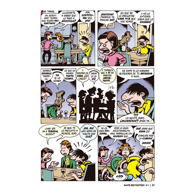 EL ESPERADO REGRESO DE BUDDY Y SUS DESASTROSOS COLEGAS EN UN FLAMANTE VOLUMEN DE MATERIAL NUEVO Y ABSOLUTAMENTE INÉDITO! Ha pasado un porrón de años desde que Buddy encontró a Lisa, momento en que el destino de ambos quedó unido para siempre. Hoy tienen un hijo en común, Harold, que ya empieza a tener claro cómo debe vivir su vida, y son tíos de Alexis y Tyler, vástagos de su hermana Babs, quien, por cierto, acaba de ver frustrada la boda con su novio pakistaní, un lumbrera que dice ser musulmán solo cuando le conviene. La vida es una tragedia continuada y Buddy Bradley sigue siendo el mismo, un don nadie, al fin y al cabo lo que siempre había deseado, pero el tiempo pasa para todos y de ello dan prueba estas páginas, donde se alterna el pasado y el presente de unos personajes cuyas neurosis no han hecho sino ir a más. En Odio desatado! conviven recuerdos inéditos que completan la biografía de nuestro héroe, como algunas de sus correrías junto a Apestoso a fi nales de los ochenta, con la penosa situación actual de su antiguo socio politoxicómano Jay, la deriva trumpista de su vieja o la circunstancia de Valerie, que aunque vive en pareja con George Hamilton III, viejo compañero de piso de Buddy, suele marcarse unas escapadas regulares a París patrocinada por un vejestorio adinerado. Si quieres saber qué fue de todos y cada uno de los personajes que poblaron la serie independiente más memorable de los 90, Peter Bagge nos trae todas las respuestas en esta antología de nuevas historietas. La mejor noticia para el mundo del arte desde la muerte del grunge!