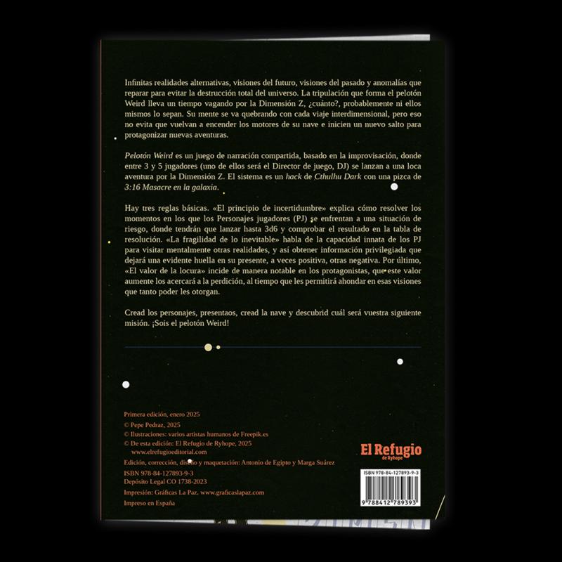 Pelotón Weird es un juego de narración compartida, basado en la improvisación, donde entre 3 y 5 jugadores (uno de ellos será el Director de juego) se lanzan a una loca aventura por la Dimensión Z. El sistema es un hack de Cthulhu Dark con una pizca de 3:16 Masacre en la galaxia.