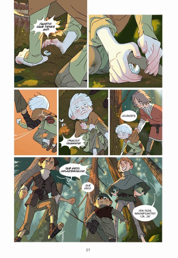 Martino es el hijo más joven y menos querido de una familia. Al ser albino, se le considera el causante de toda suerte adversa, hasta el punto de que un día su padre lo repudia. Tras huir de casa, Martino no sólo tendrá que aprender a aceptar su diversidad, sino sobre todo comprender que no es la palidez de su piel o el color de su pelo lo que le hace sentirse tan solo y equivocado. Irene Marchesini y Carlotta Dicataldo crean un mundo rico y detallado, maravillosamente verosímil y, por tanto, aún más aterrador, en el que los marginados se protegen entre sí, en el que uno se vuelve loco si se le da tiempo a una larva para que se convierta en insecto y aprenda a volar, y en el que comprender la propia identidad real hace latir de vida el corazón.