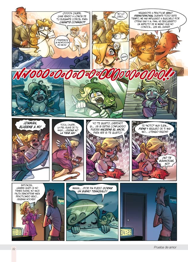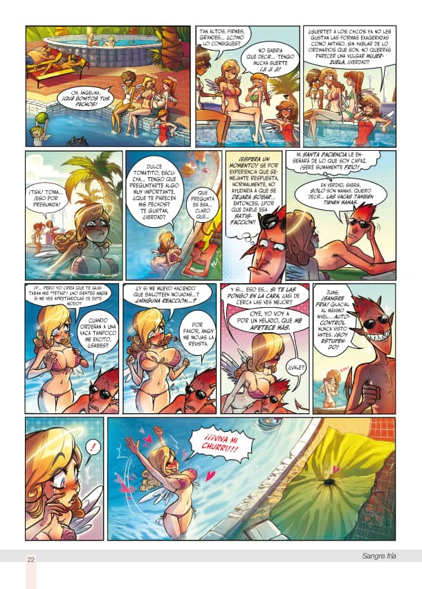 Angelina y Damián demuestran que los polos opuestos se atraen: ella es un ángel, guapísima y de curvas generosas, él un diablo algo flaco y gafado. Pero igualmente, se aman con locura. Lástima que Angelina quiera mantenerse pura hasta el matrimonio: tiene que preservar su virginidad. La misma que Damián intentará quitarle antes de tiempo. ¿Cómo conseguirá resistir el pobre diablo a su angélical tentación?. Entre sensualidad, curvas generosas y malos entendidos, por fin llega a España el primer volumen del best seller que ha encendido Italia.