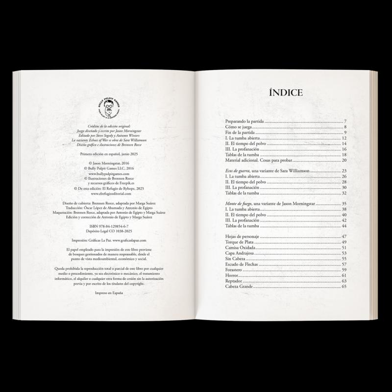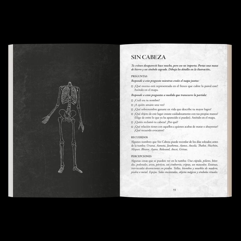 Incluye un capítulo sobre cómo jugar, la propuesta original de juego más dos variantes, un anexo con cosas alternativas que probar durante las partidas, y un apartado final con los nueve tipos de personaje que podréis interpretar, junto a ilustraciones de esqueletos que intervenir conforme vayáis conociendo quiénes sois.