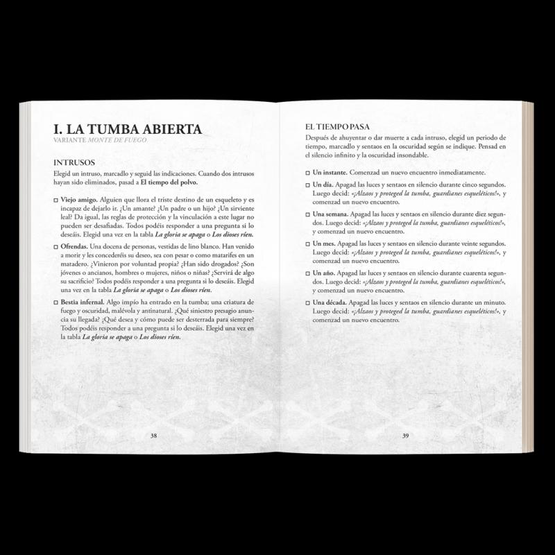 Al comenzar no sabéis nada sobre la historia que va a acontecer, al igual que los esqueletos no recuerdan nada de su vida. Cada uno de ellos es un enigma que iréis descifrando durante la partida. Trabajáis juntos para esbozar el contorno de la tumba en un mapa que iréis completando con el paso del tiempo. Una partida se desarrolla a lo largo de tres eras o fases de juego (La tumba abierta, El tiempo del polvo y La profanación). Cuando un intruso profana la tumba se produce un encuentro: los esqueletos entran en acción para defenderla, tal es su condena. Al mismo tiempo, recuerdan fragmentos de su pasado. Todo a través de la narración compartida entre los jugadores.