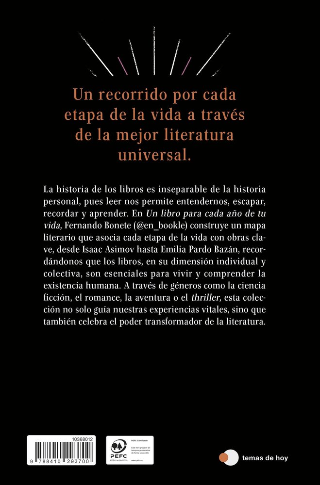 La historia de los libros es inseparable de la historia personal, pues leer nos permite entendernos, escapar, recordar y aprender. En Un libro para cada año de tu vida, Fernando Bonete (@en_bookle) construye un mapa literario que asocia cada etapa de la vida con obras clave, desde Isaac Asimov hasta Emilia Pardo Bazán, recordándonos que los libros, en su dimensión individual y colectiva, son esenciales para vivir y comprender la experiencia humana.