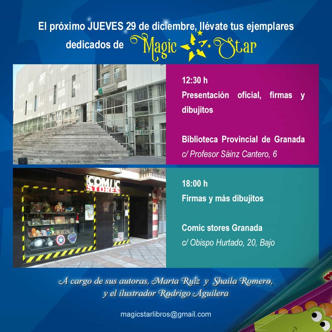 El próximo jueves 29 de diciembre tenemos un evento muy especial en la librería de Granada. Presentamos a las 6 de la tarde los dos títulos publicados hasta el momento de Magic Star, de la mano de sus autoras: Shaila Romero y Marta Ruiz; y del ilustrador Rodrigo Aguilera.