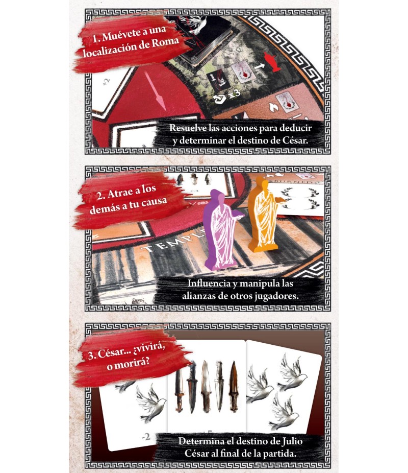 Contenido: 1 tablero de juego 1 tablero de votación 1 curia en 3D 1 escaleras a la curia en 3D 1 daga de madera serigrafiada 8 ciudadanos de madera serigrafiados 8 fichas de votación a doble cara 8 cartas de referencia 86 cartas de destino 68 cartas de influencia 25 cartas de intrigas 25 cartas de ciudadano