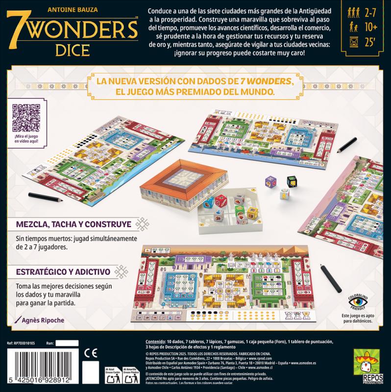 https://comicstores.es/producto/7-wonders-dice_5921995921997 WONDERS DICEConduce a una de las siete ciudades más grandes de la Antigüedad a la prosperidad. Construye una maravilla que sobreviva al paso del tiempo, promueve los avances científicos, desarrolla el comercio, sé prudente a la hora de gestionar tus recursos y tu reserva de oro y, mientras tanto, asegúrate de vigilar a tus ciudades vecinas: ¡ignorar su progreso puede costarte muy caro!