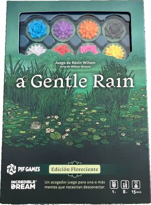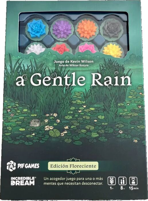 Diseño compacto. A Gentle Rain es un juego compacto con solo 28 losetas y ocho fichas de madera, que caben en una caja del tamaño de un azucarero.