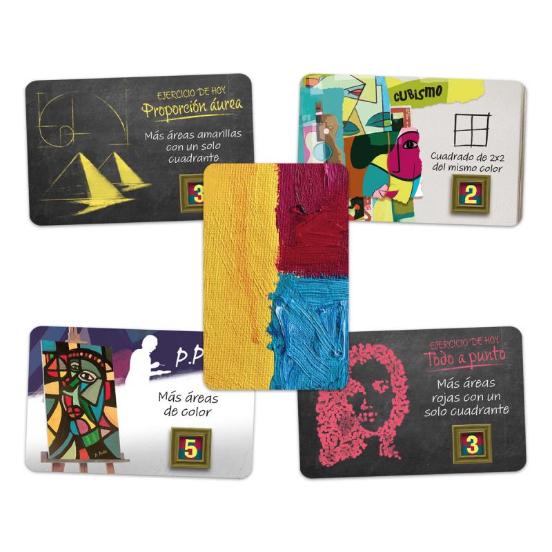 Una vez lleno el lienzo, las dos filas más cercanas a ti forman tu zona de puntuación. Si los patrones de color de tu zona completan una carta de puntuación mejor que los patrones de la zona de cualquier otro jugador, reclamas la carta de puntuación. Además, si has creado el patrón correcto en tu zona de puntuación, puedes puntuar tu carta de inspiración. ¡Quien consiga más puntos después de tres rondas será el alumno estrella de la Academia Abstracta y ganará!
