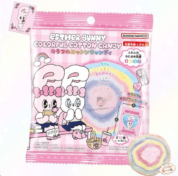 Dulce, esponjoso y 100?% adorable! El algodón de azúcar Esther Bunny Colorful de 17?g es una nube multicolor con 6 sabores distintos (lima, limón, fresa, azúcar, uva y melocotón), perfecta para fans del estilo kawaii.