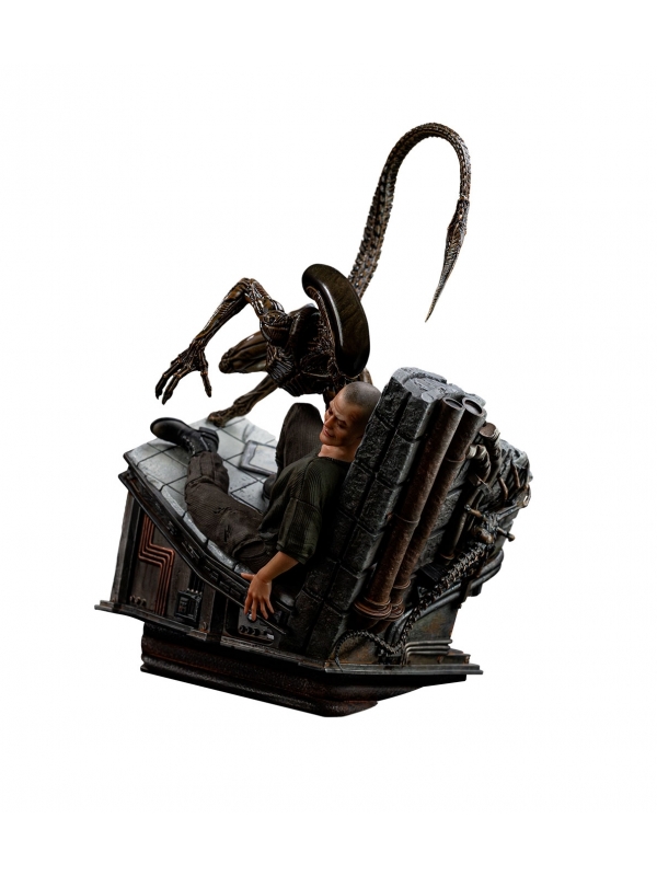 La escultura muestra a Ripley en una pose serena pero desafiante, mientras el xenomorfo se inclina amenazante a su espalda, desplegando su anatomía biomecánica con un nivel de detalle impresionante. La base industrial recrea el entorno metálico de la prisión, con texturas, cables y acabados que refuerzan la ambientación futurista y claustrofóbica.