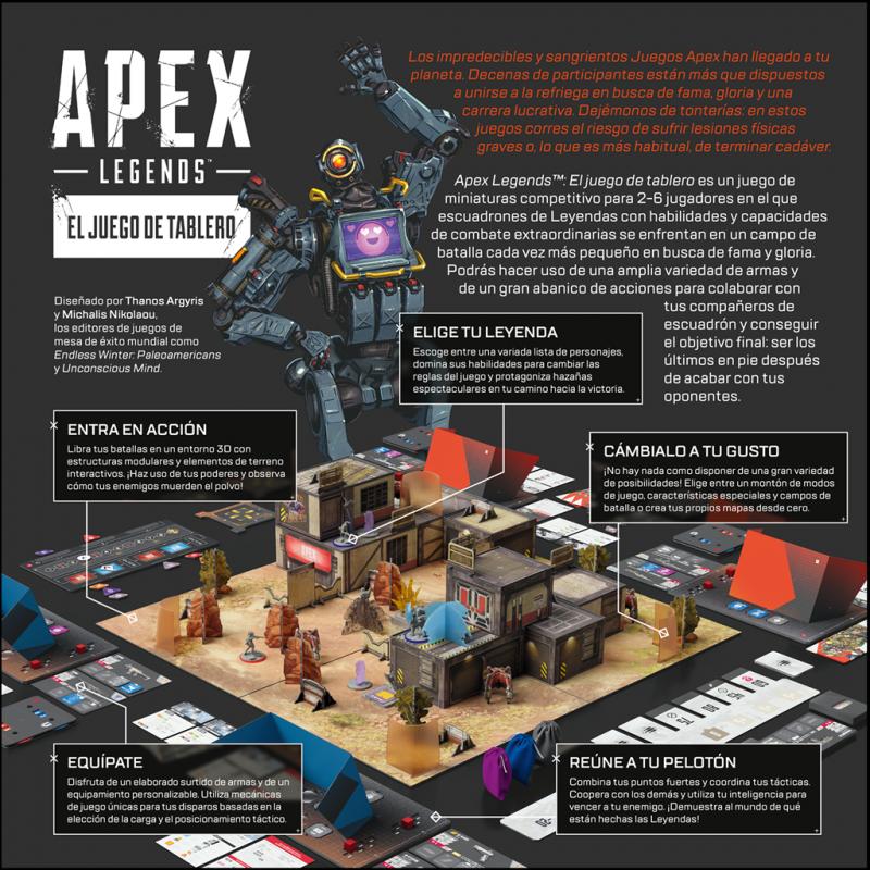 Apex Legends: El juego de tablero es un juego de miniaturas competitivo para 2-6 jugadores en el que escuadrones de Leyendas con habilidades y capacidades de combate extraordinarias se enfrentan en un campo de batalla cada vez más pequeño en busca de fama y gloria.