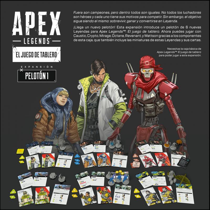 ¡Llega un nuevo pelotón! Esta expansión introduce un pelotón de 6 nuevas Leyendas para Apex Legends: El juego de tablero. Ahora puedes jugar con Caustic, Crypto, Mirage, Octane, Revenant, y Wattson gracias a los componentes de esta caja, que también incluye las miniaturas de estas Leyendas y sus cartas.