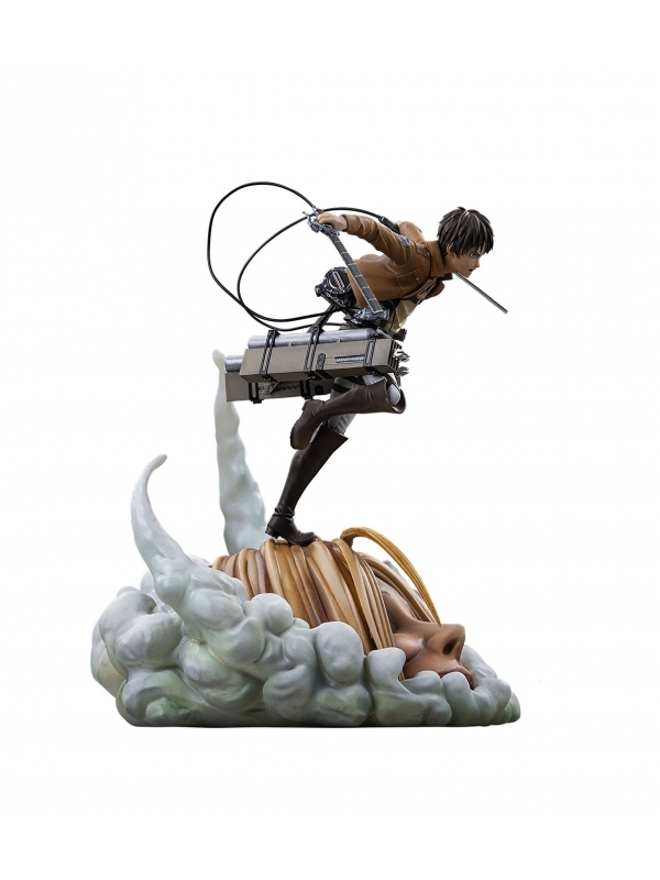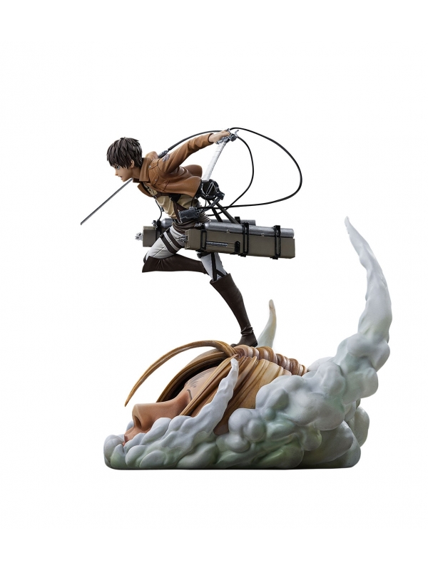 La escultura muestra a Eren equipado con el sistema de maniobras tridimensional, lanzándose al combate con sus espadas desenvainadas mientras emerge entre nubes de humo y restos del enfrentamiento. La base, con el impactante detalle del titán bajo sus pies, aporta dramatismo y convierte la figura en una auténtica escena tridimensional llena de movimiento.