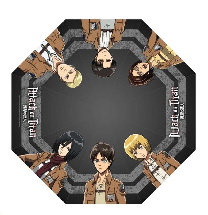 Protege tus días de lluvia con esta espectacular sombrilla de Ataque a los Titanes con diseño grupal, protagonizada por algunos de los personajes más icónicos del Cuerpo de Exploración. Su ilustración circular crea un efecto visual envolvente que destaca desde cualquier ángulo y convierte un accesorio cotidiano en una pieza llena de personalidad.