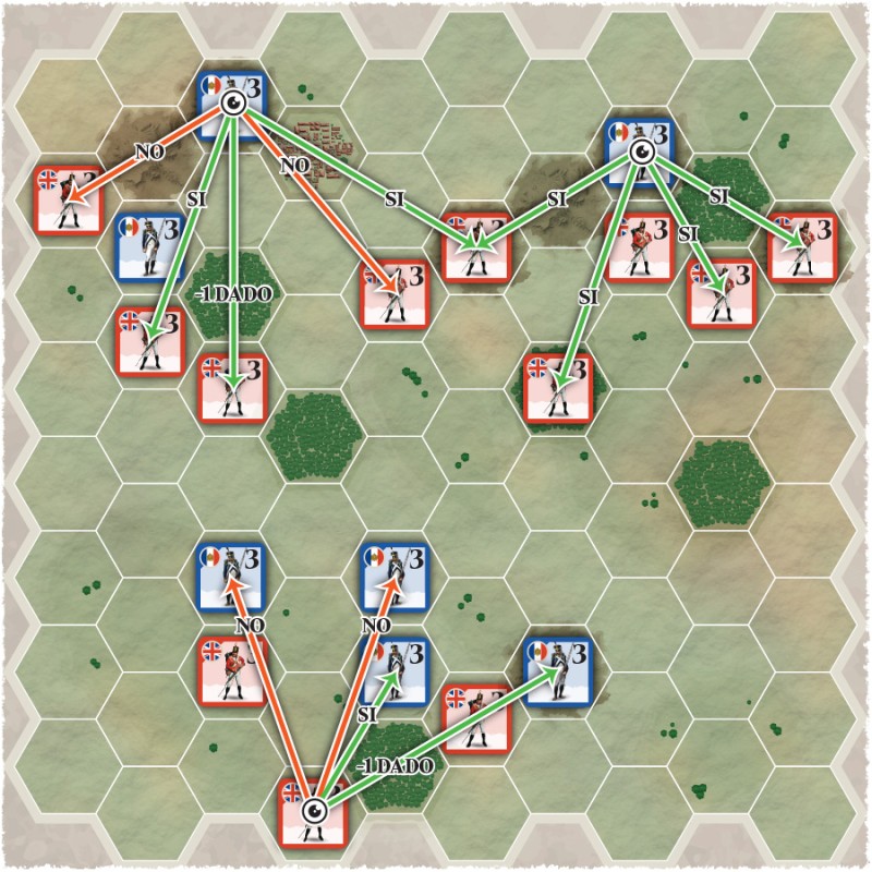 Cada escenario cuenta con un mapa con rejilla hexagonal y unas instrucciones de despliegue de las unidades del jugador y de la IA y su comportamiento. Las unidades muestran un número con su fuerza de combate, que junto con el tipo de unidad, objetivo y modificadores de terreno, atacarán con más o menos dados. Hay 4 tipos de unidades: infantería, caballería, comandante y artillería, con sus propias características. El terreno influye en el combate, alterando el número de dados que se lanzan. Incluye un sistema sencillo de línea de visión. La gestión de la IA es muy ágil. Cada escenario nos indica dónde despliegan y cómo se comportan sus unidades según su tipo.