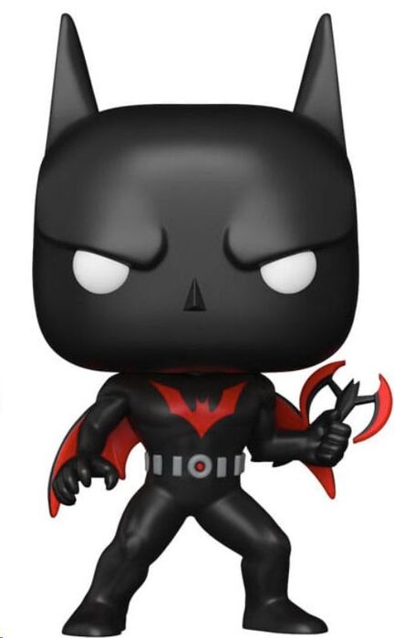 Esta figura Pop! representa a Terry McGuinness, el nuevo Batman del universo de Batman Beyond, con su icónico traje negro futurista. El diseño es limpio y elegante, destacando el símbolo rojo del murciélago en el pecho y una capa también roja que sobresale por los hombros, aportando dinamismo al conjunto. El casco tiene un acabado mate, con orejas puntiagudas y una expresión decidida que transmite fuerza y determinación.