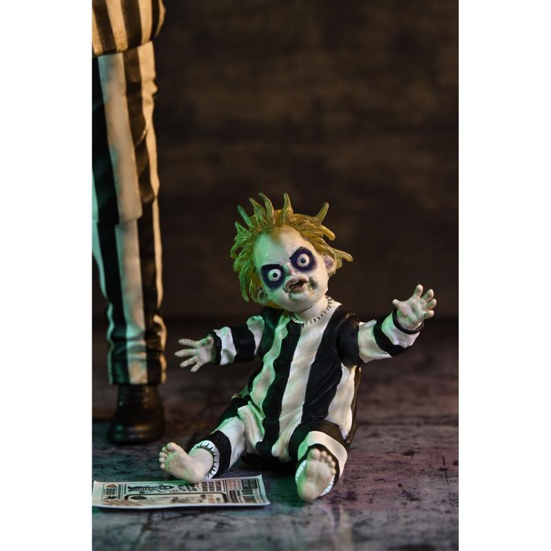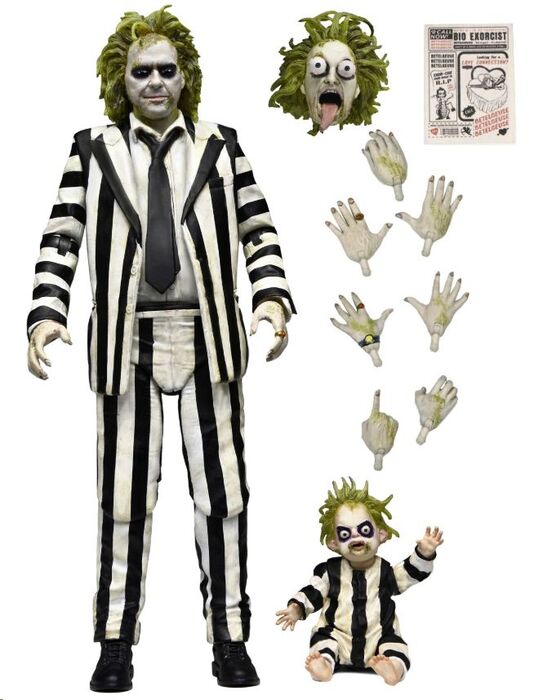 Viene cargado de extras para que le des el toque más caótico posible: una cabeza extra , siete manos intercambiables , el mítico folleto de Betelgeuse y, por si fuera poco, ¡el adorable Baby Beetlejuice !
