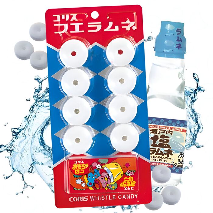 Dale un toque de diversión a tu snack con el clásico Whistle Fue sabor a ramune! Este caramelo japonés no solo tiene el refrescante sabor de la popular soda ramune, sino que además puedes hacerlo sonar como un silbato antes de comerlo. Su textura crujiente y su dulzura equilibrada lo convierten en un imprescindible para los amantes de los dulces nipones. Está elaborado con glucosa, azúcar, emulsionantes, acidulante, pullulan, almidones modificados y aroma, asegurando un sabor auténtico y delicioso.