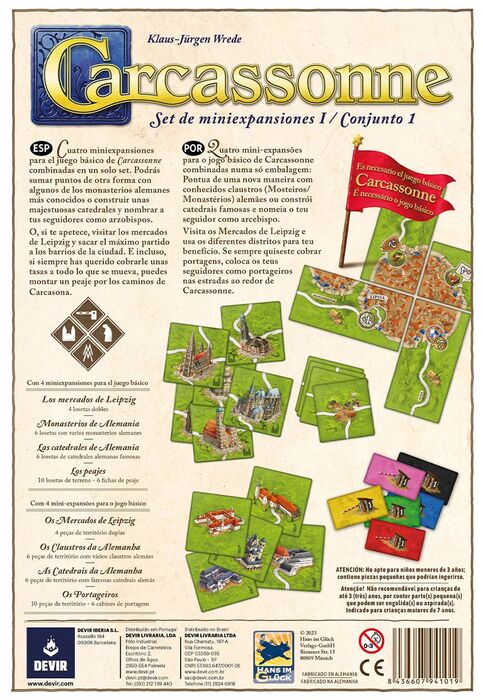 ¡Amplía tu colección de Carcassonne y dale un toque germánico con este set de miniexpansiones! Se trata de 4 nuevos módulos para el juego básico: los mercados de Leipzig, monasterios de Alemania, las catedrales de Alemania y los peajes. Nuevos componentes que darán un giro táctico al clásico título de colocación de losetas.
